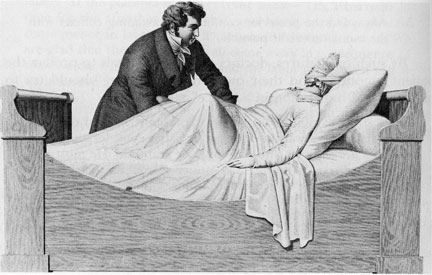 “Embarrassment and constraint became part of the birth process; physicians were greatly hindered, as midwives had never been, by firmly established canons of female modesty. Men could not look directly at their patients’ genitals, but had to examine them only by touch while they remained fully clothed.Often deeply uncomfortable with a bedchamber full of women looking on – sometimes critically – doctors tried to persuade expectant mothers to clear them out of the birthing room.”